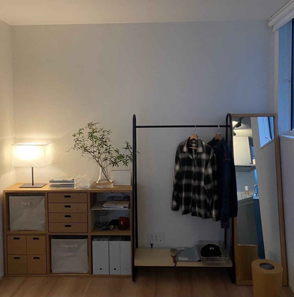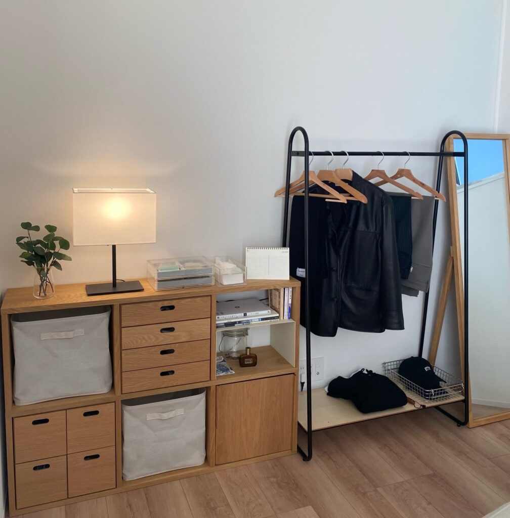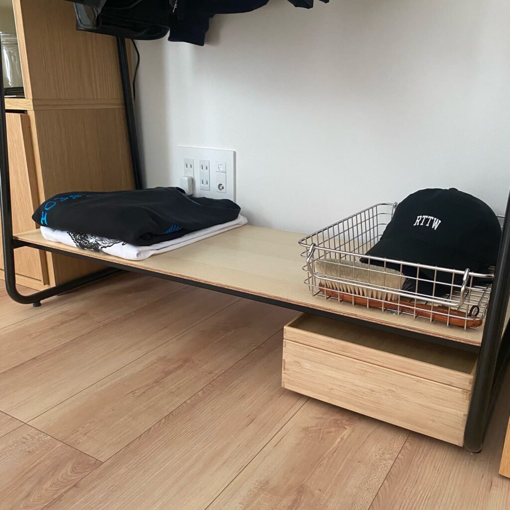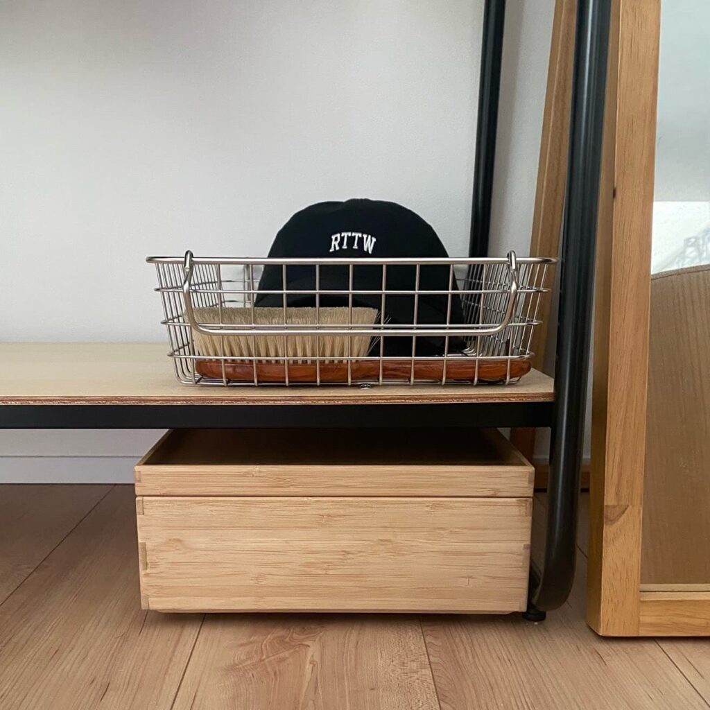 セットの引出しなどは無いのですが、わが家は無印良品の竹製ボックスを使ってハンガースタンド下を収納スペースにしました。