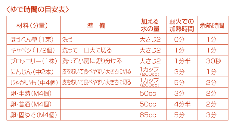 「この時間で出来る?生茹でにならない?」と半信半疑だったのですが、どの食材も本当に上の表通りの時間で美味しく茹で上がります。
