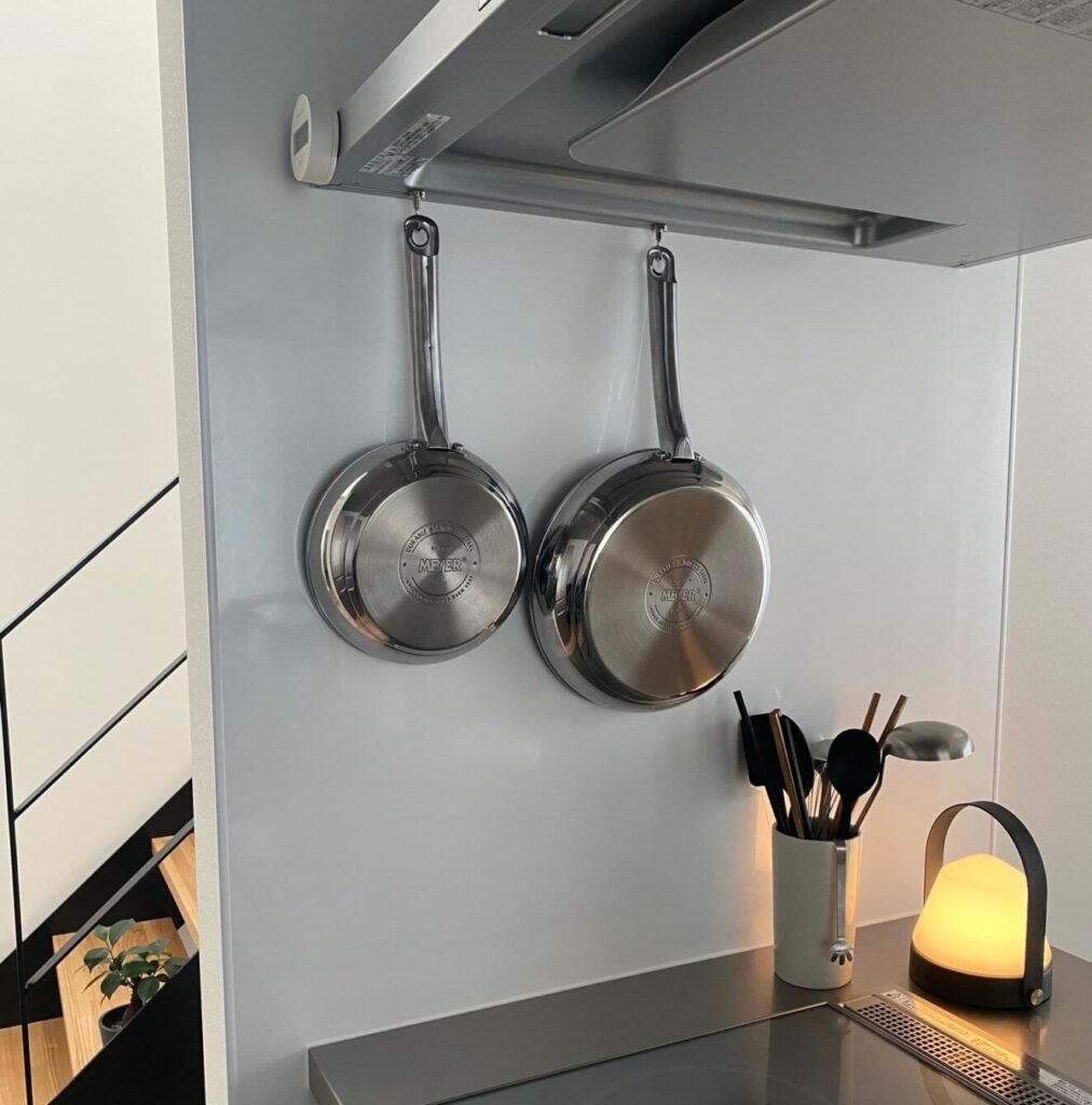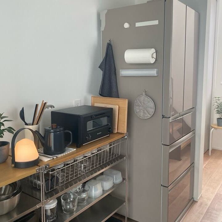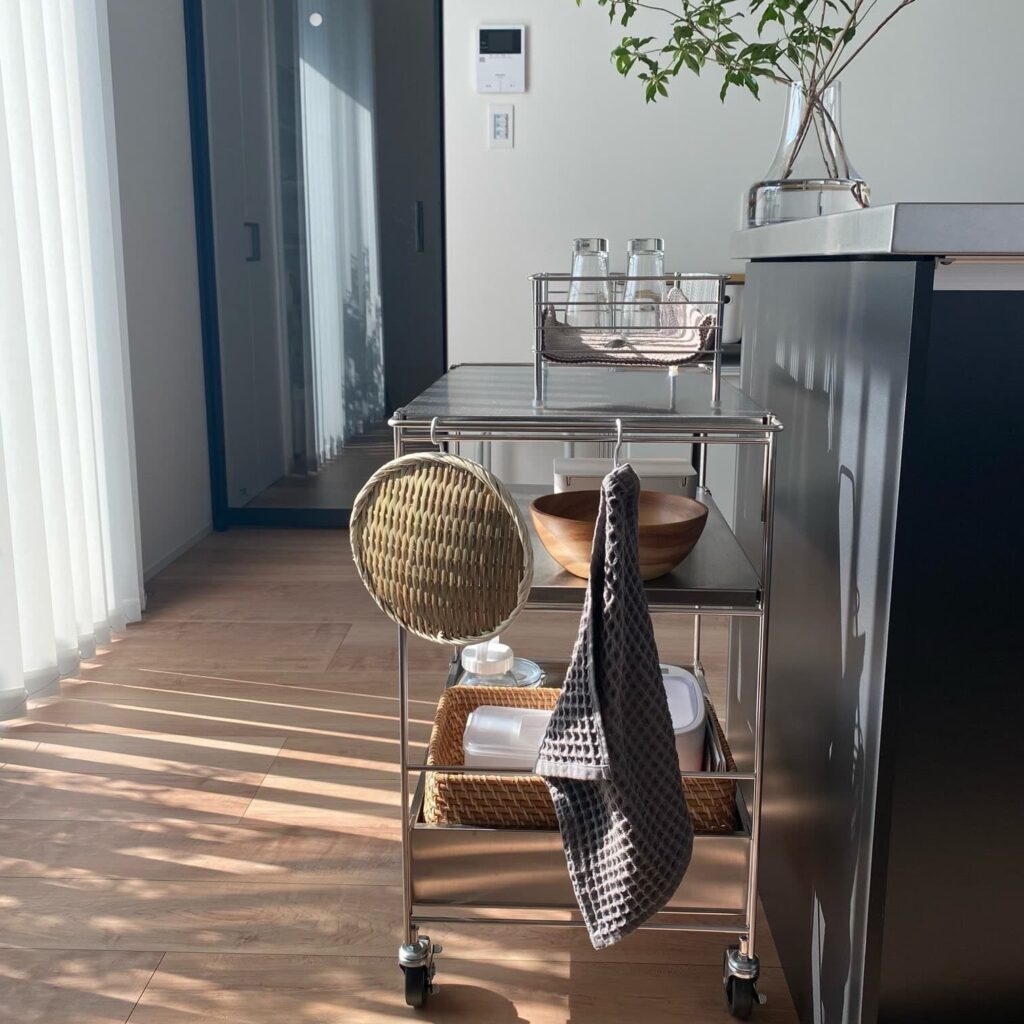 キッチン収納がほぼないアパートに暮らしていた時に買った物で、これを置くとキッチンの通路が少し狭くなってしまうのですが吊り下げ収納が便利すぎて手放すという選択肢はありません。